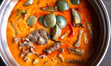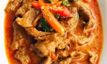 Thick, Sweet and Savory Red Curry that only comes in one spice level. This is a Spicy dish made with Traditional thai chili paste. If you cannot handle the heat please do not order this dish.