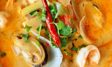 Thai Classic Spicy and Sour Coconut Based Soup Infused with Mushrooms, Lemongrass, Kaffir Lime Leaves, Chilies, and Galagal