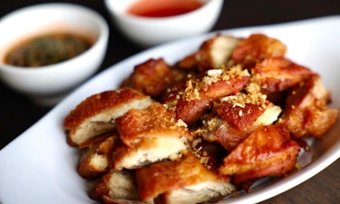 Crispy Golden Fried Garlic Chicken Served with a Side of Sticky Rice