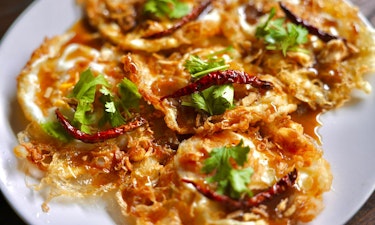 5 Crispy Golden Fried Eggs covered in a Sweet, Savory and Tangy Gravy and garnished with Crispy Fried Onions and Deep Fried Dried Crispy Chilies