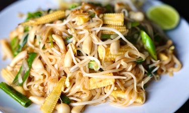 Thai Street Style Stir Fried Noodles with Spring Onions, Topped with Crushed Peanuts, Fresh Beansprouts, and a Lime Wedge