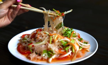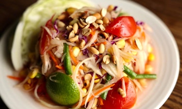 Thai Papaya Salad with a Medley of Vegetables, Fresh Chillies, Tomato, Lime, and Peanuts